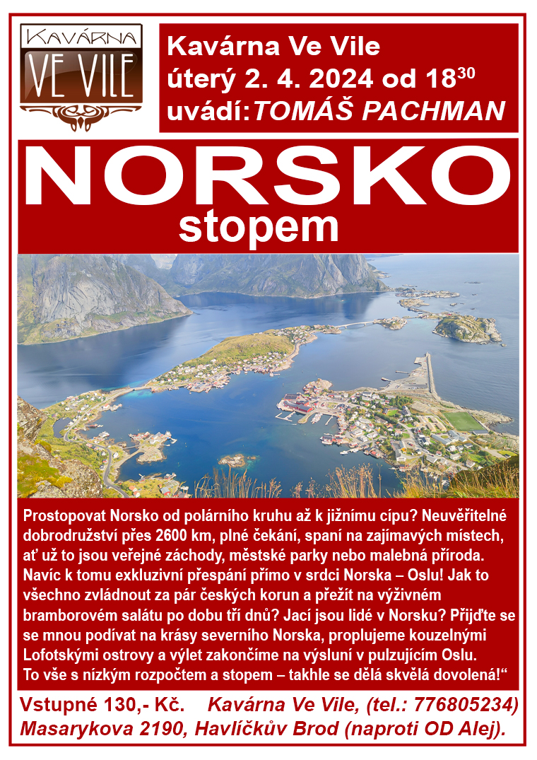 Prostopovat Norsko od polárního kruhu až k jižnímu cípu? Neuvěřitelné dobrodružství přes 2600 km, plné čekání, spaní na zajímavých místech, ať už to jsou veřejné záchody, městské parky nebo malebná příroda. Navíc k tomu exkluzivní přespání přímo v srdci Norska – Oslu! Jak to všechno zvládnout za pár českých korun a přežít na výživnémbramborovém salátu po dobu tří dnů? Jací jsou lidé v Norsku? Přijďte se se mnou podívat na krásy severního Norska, proplujeme kouzelnými Lofotskými ostrovy a výlet zakončíme na výsluní v pulzujícím Oslu. To vše s nízkým rozpočtem a stopem – takhle se dělá skvělá dovolená!“