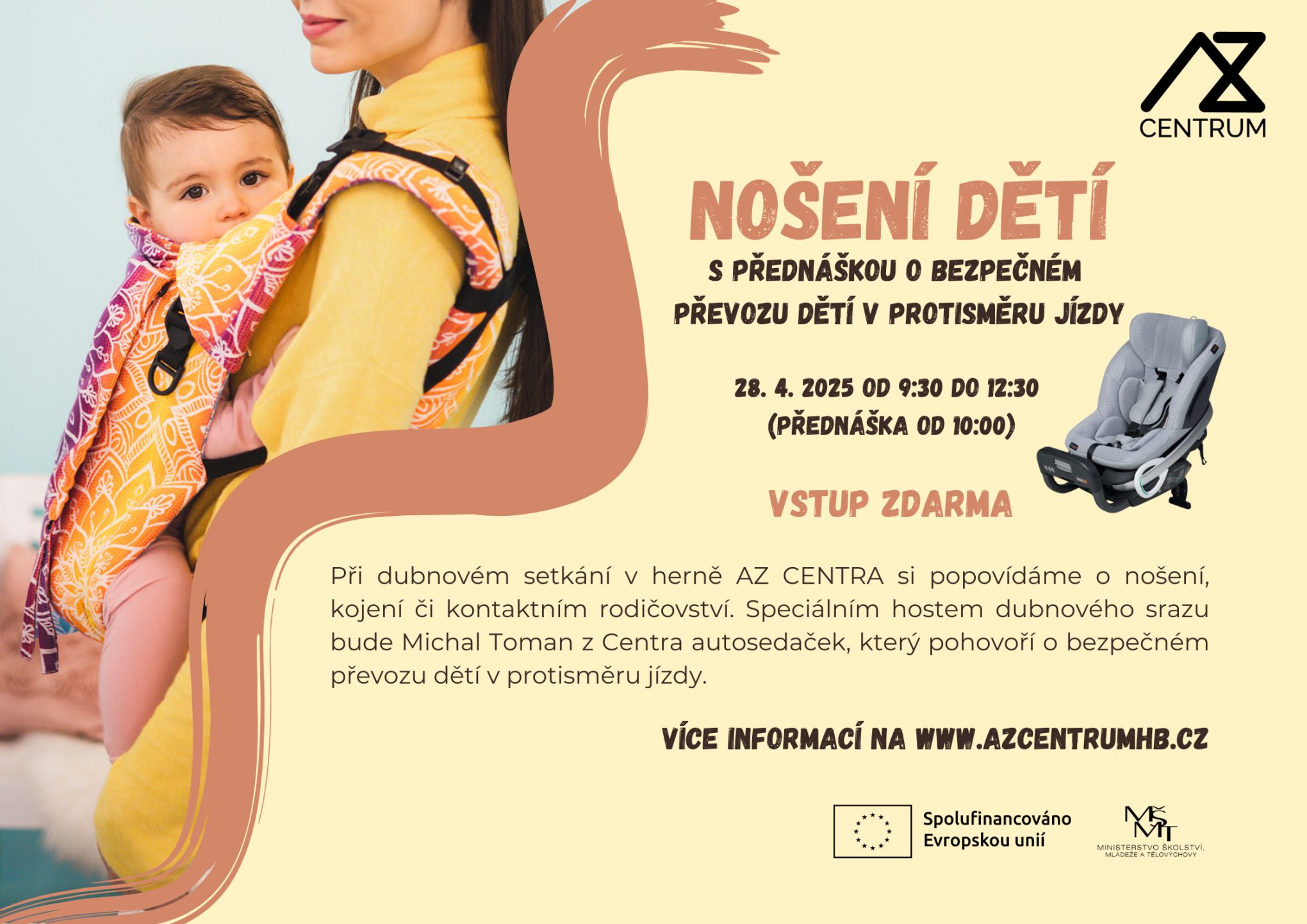 Tradiční nosící sraz v AZ CENTRU se tentokrát vedle nošení dětí, kojení a kontaktního rodičovství zaměří také na bezpečný převoz dětí v protisměru jízdy.