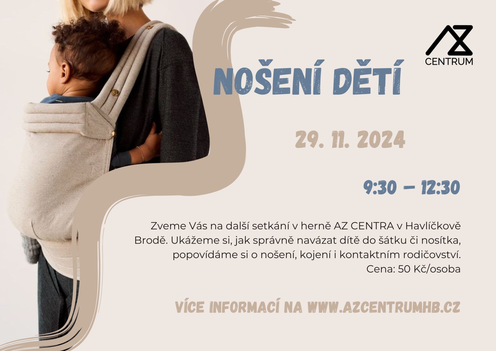 Zveme Vás na další setkání v herně AZ CENTRA v Havlíčkově Brodě. Ukážeme si, jak správně navázat dítě do šátku či nosítka, popovídáme si o nošení, kojení i kontaktním rodičovství.