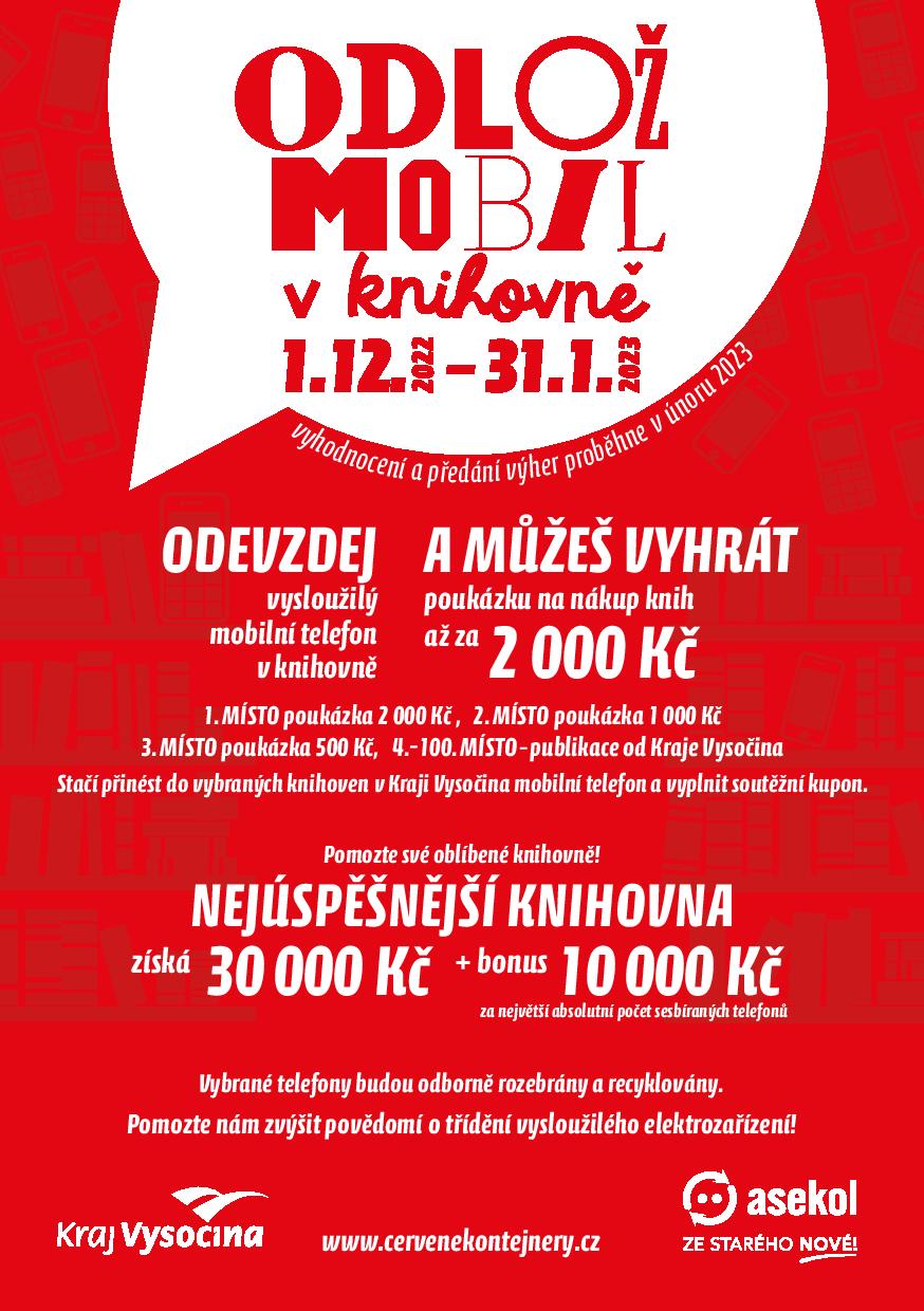 Téměř po roce se opět připojujeme k soutěži Odlož mobil v knihovně. Díky ní můžete vyhrát poukázku na nákup knih v hodnotě až 2000 Kč. Stačí přinést starý mobilní telefon a vyplnit soutěžní kupon. A nemusí to být jen jeden mobilní telefon, soutěž není limitována počtem, čím více přístrojů přinesete, tím větší máte šanci na výhru. Sběrné místo je u Centrálního pultu.