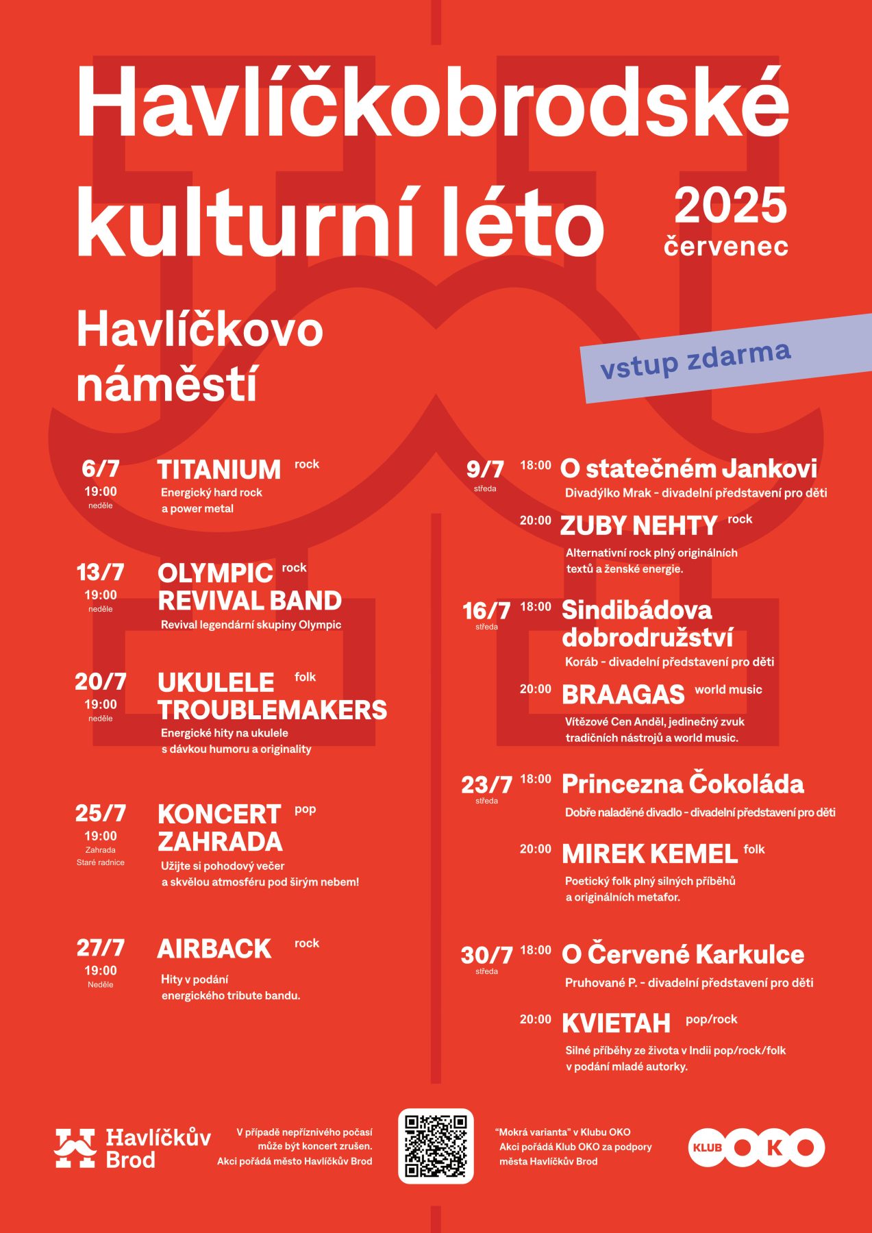 Srdečně vás zveme na další ročník oblíbeného Havlíčkobrodského kulturního léta, který se v roce 2025 odehraje na Havlíčkově náměstí a v zahradě Staré radnice. Těšit se můžete na pestrou paletu hudebních i divadelních vystoupení, kapely oceněné Cenou Anděl, koncertní objevy i slavné revivaly a pohádková představení pro děti. Všechny akce jsou pro návštěvníky zcela zdarma!