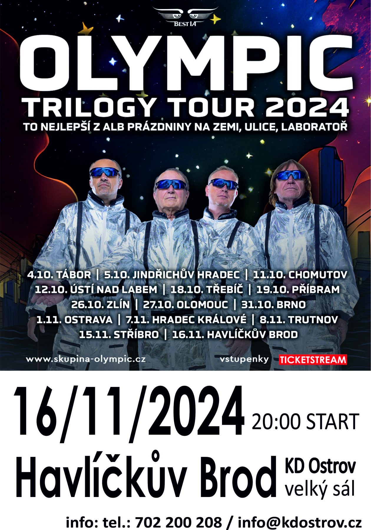 Návrat legendární Trilogie skupiny Olympic je tady. Velkolepá show plná dechberoucích efektů, projekcí a hlavně toho nejlepšího z kultovních alb Prázdniny na Zemi, Ulice a Laboratoř. Je to nejspíš poslední možnost slyšet, vidět a zažít na vlastní kůži ucelené kouzlo těchto tří zásadních alb, která fungují dohromady jako symfonie. A aby byl zážitek kompletní, nepřijdete ani o ty největší hity z šedesátileté historie kapely Olympic. 30 jedinečných limitovaných koncertů po celé České republice, to je Trilogy Tour 2024!