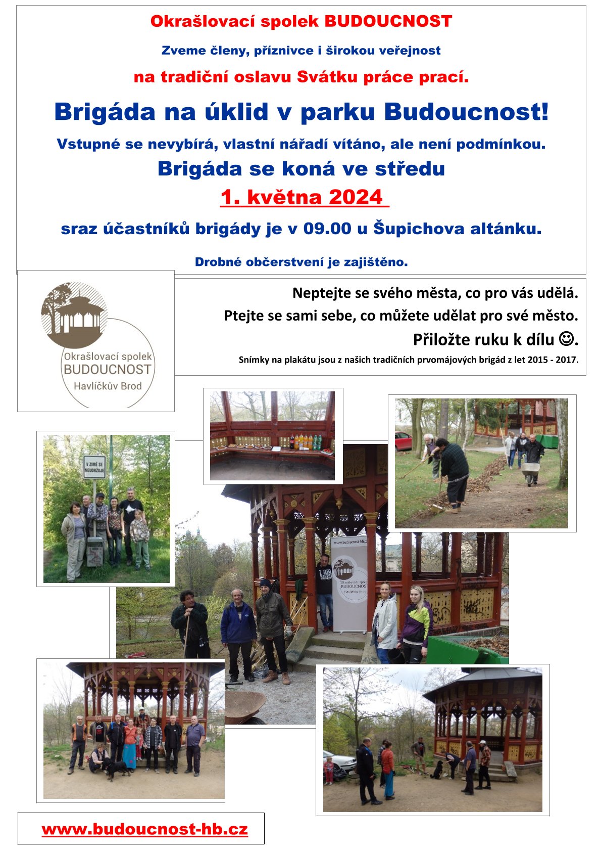 Oslava svátku práce prací. Tradiční jarní úklid v parku Budoucnost u Šupichova altánku, každá pomocná ruka vítána, potřebné nářadí k dispozici, drobné občerstvení zajištěno.