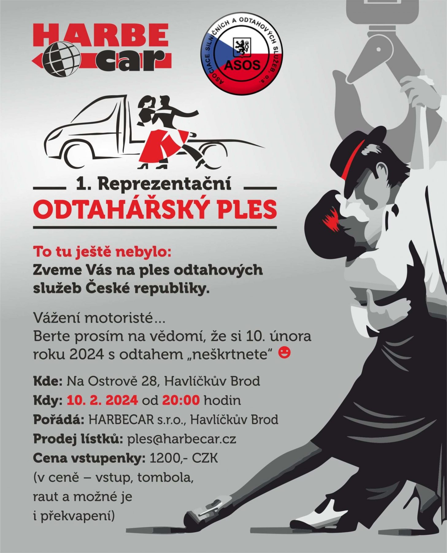 ZVEME VÁS NA ODTAHOVÝ PLES REZERVACE NA: ples%z%harbecar.cz PŘEDPRODEJ: Ledečská 2628, Havlíčkův Brod prodejní doba: po - pá 8:00 - 16:00 Cena vstupenky: 1200,- v ceně: VSTUP, TOMBOLA, RAUT, PŘEKVAPENÍ