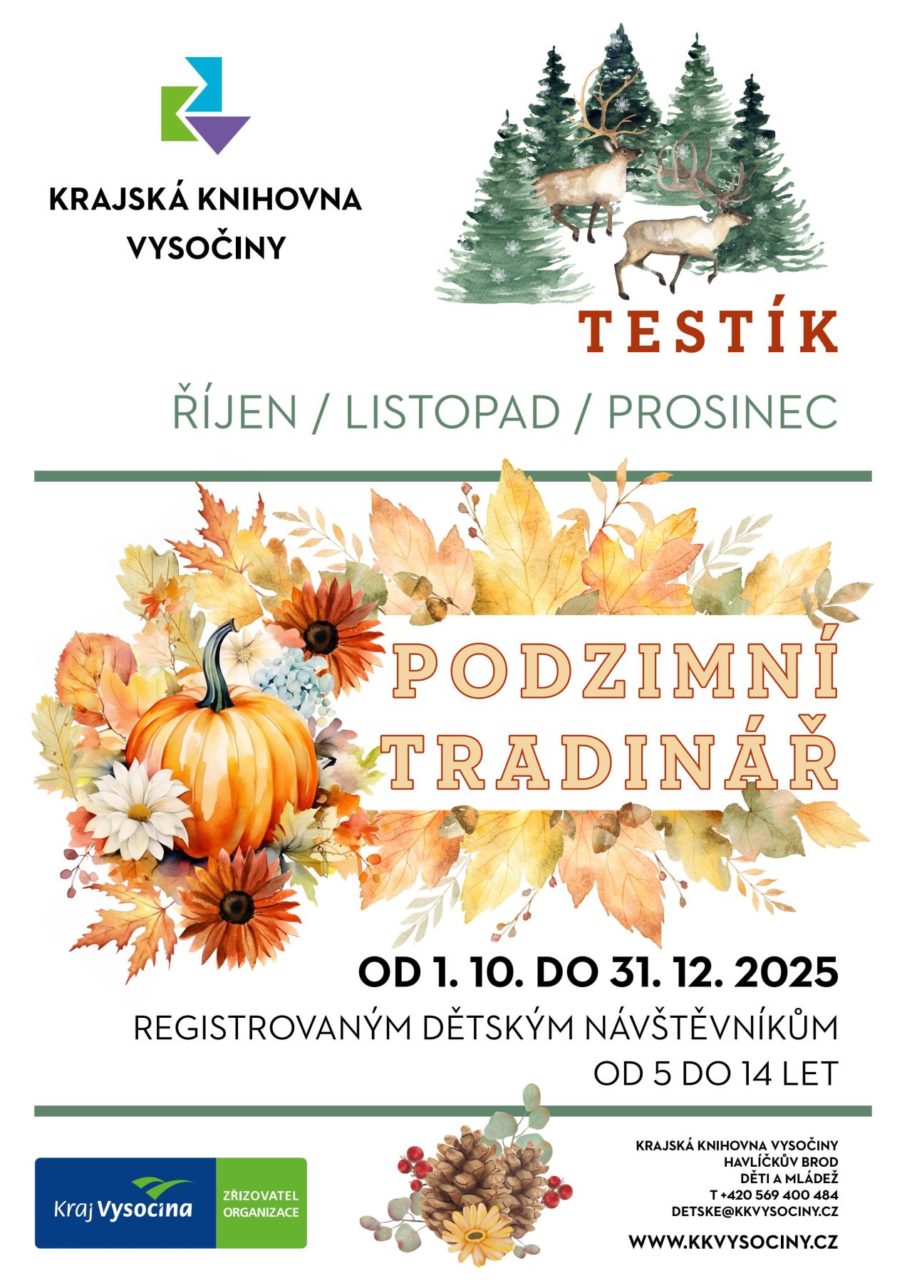 Soutěž pro děti o ceny na měsíce říjen, listopad a prosinec. Tentokrát na téma Podzimní tradinář. Soutěžící děti zodpoví několik jednoduchých otázek na dané téma. Pokud jim nebudou stačit jejich chytré hlavičky, mohou využít knih a časopisů v knihovně. V knihovně budou od 1. října do 31. prosince 2025 připraveny soutěžní kartičky. Správné odpovědi budou slosovány a výhercům předáme odměnu. Vyplněné testíky mohou děti odevzdávat na oddělení pro děti a mládež. Soutěž je určena dětem od 6 do 15 let (registrovaným dětským návštěvníkům KKV).