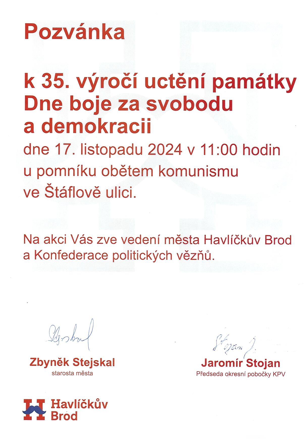Pozvánka k 35. výročí uctění památky Dne boje za svobodu a demokracii
