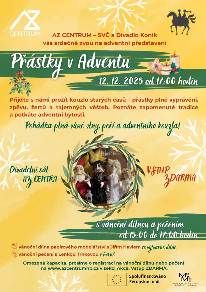 AZ CENTRUM – SVČ a Divadlo Koník vás srdečně zvou na adventní představení Přástky v Adventu dne 12. 12. 2025 od 17:00. Přijďte s námi prožít kouzlo starých časů – přástky plné vyprávění, zpěvu, žertů a tajemných věšteb. Poznáte zapomenuté tradice a potkáte adventní bytosti. Před divadelním představením proběhne vánoční modelářská dílna s výrobou ozdob a vánoční pečení. AKCE JE ZDARMA. Na vánoční dílnu prosíme z důvodu omezené kapacity registraci na www.azcentrumhb.cz v sekci Akce.