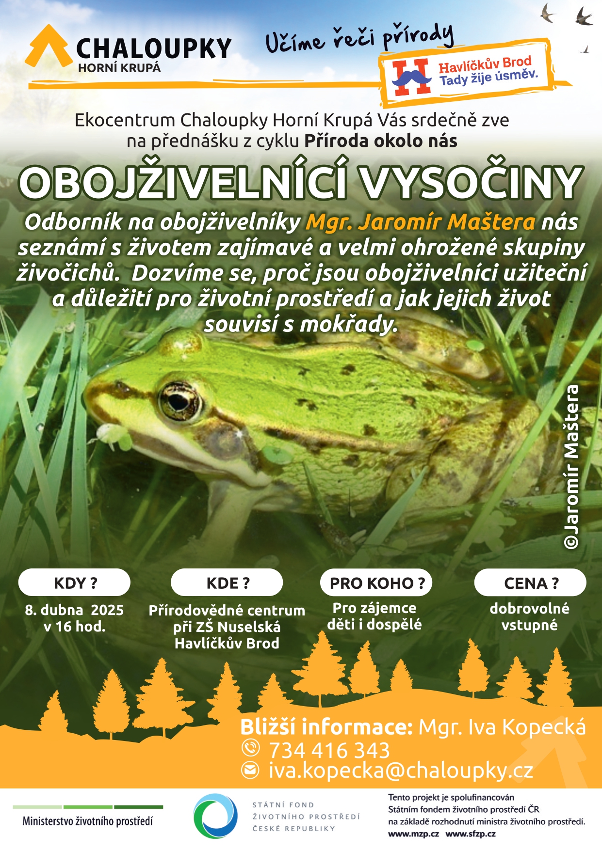 Odborník na obojživelníky Mgr. Jaromír Maštera nás seznámí s životem zajímavé a velmi ohrožené skupiny živočichů. Dozvíme se, proč jsou obojživelníci užiteční a důležití pro životní prostředí a jak jejich život souvisí s mokřady. Dozvíme se mnoho zajímavostí ze životů obojživelníků. Pořádá Ekocentrum Chaloupky Horní Krupá ve spolupráci s Přírodovědným centrem Nuselská.