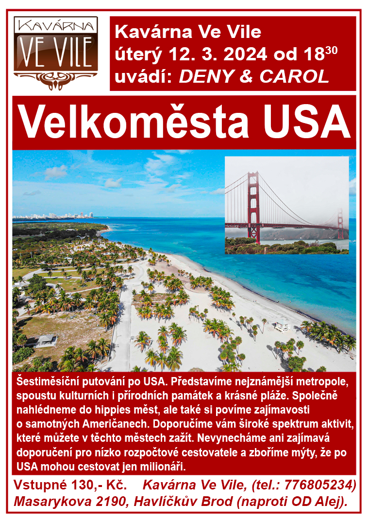 Přednáška o 6-měsíčním putování po USA. Představíme nejznámější metropole, spoustu kulturních i přírodních památek a krásné pláže. Společně nahlédneme do hippies měst, ale také si povíme zajímavosti o samotných Američanech. Doporučíme vám široké spektrum aktivit, které můžete v těchto městech zažít. Nevynecháme ani zajímavá doporučení pro nízko rozpočtové cestovatele a zboříme mýty, že po USA mohou cestovat jen milionáři.