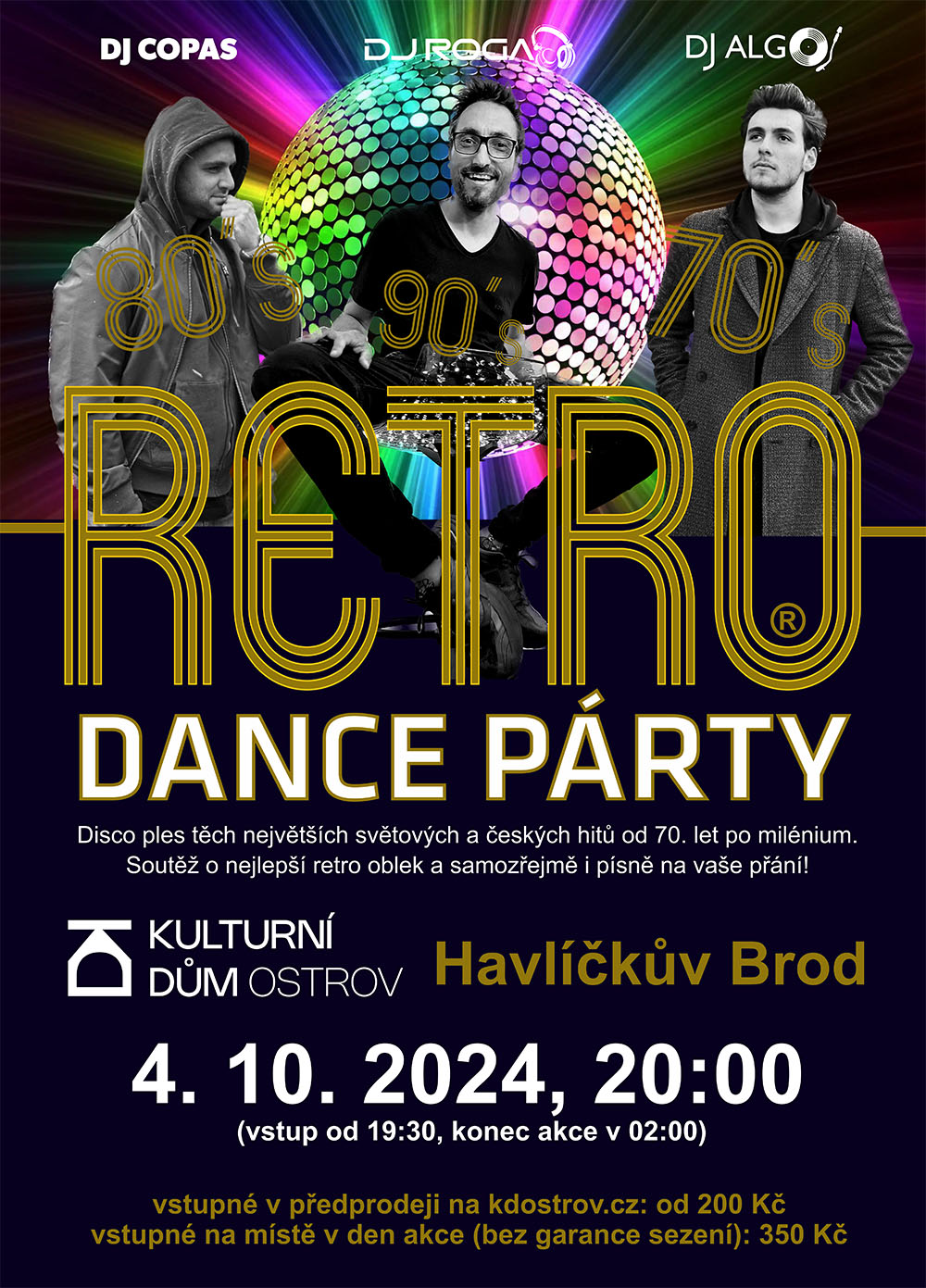 RETRO DANCE PÁRTY je šesti hodinový disco ples těch největších světových a českých hitů osmdesátých a devadesátých let s přesahem na léta sedmdesátá až po milénium. Zkrátka od Abby, přes Modern Talking až po Rihannu. Přijďte klidně v džínech, ale nejlépe retro! Nejlepší retro kostýmy budou v naší velké soutěži odměněny! Těšit se můžete na světelnou show, skvělý BOSE zvuk a soutěže! Doba je zlá, tak tancujme, dokud můžeme! Včasný předprodej do 30.4.2024 jednotně: sezení 200 KčOd 1.5.2024: : sezení 290 KčV den konání akce (bez garance sezení): 350 Kč.