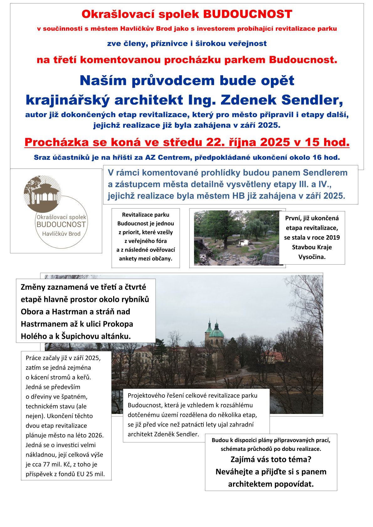 Již od konce září 2025 probíhají práce na III. a IV. etapě revitalizace parku Budoucnost v okolí rybníků Obora a Hastrman. Zatím se hlavně kácelo. Šlo především o dřeviny nezdravé, ale nejen. Proč? Akce je také velmi finančně náročná. Jak je to možné? Na tyto a všechny další možné otázky nám odpoví pan architekt Zdenek Sendler a zástupce města Havlíčkův Brod. Budeme si moci také prohlédnout plány stávající etapy revitalizace, která budo dokončena v létě roku 2026.