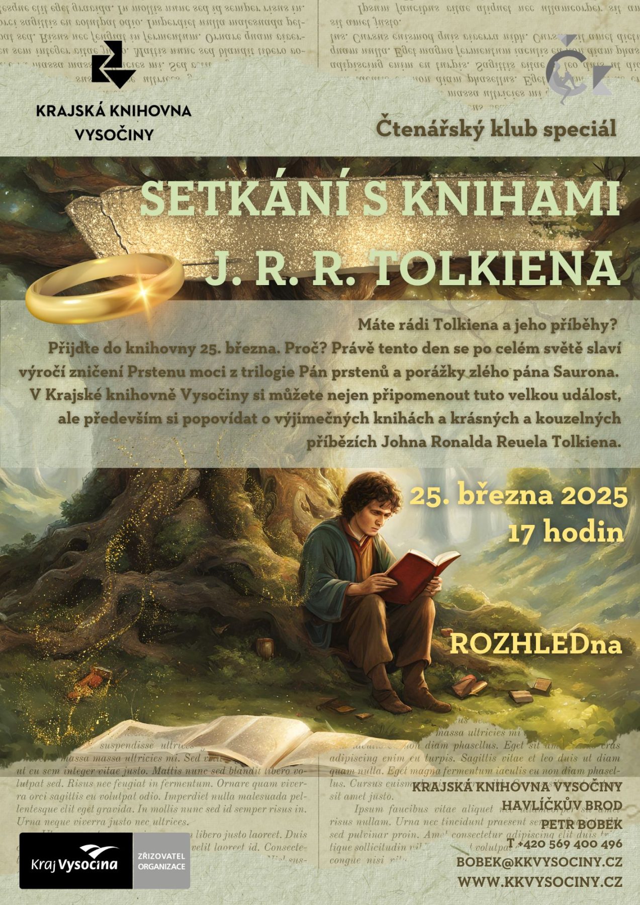 Máte rádi Tolkiena a jeho příběhy? Přijďte do knihovny 25. března. Proč? Právě tento den se po celém světě slaví výročí zničení Prstenu moci z trilogie Pán prstenů a porážky zlého pána Saurona. V Krajské knihovně Vysočiny si můžete nejen připomenout tuto velkou událost, ale především si popovídat o výjimečných knihách a krásných a kouzelných příbězích Johna Ronalda Reuela Tolkiena.