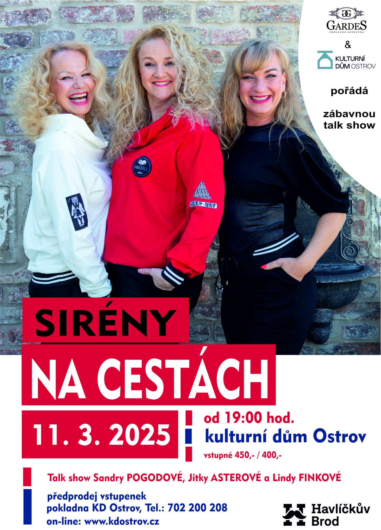 Zveme Vás na talk show ženské trojice hereček a zpěvaček Sandry POGODOVÉ, Jitky ASTEROVÉ a Lindy FINKOVÉ - "SIRÉNY NA CESTÁCH". Jejich neotřelý smysl pro humor a vzájemná chuť si ze sebe utahovat vás rozhodně pobaví. Pořad je plný šťavnatých vyprávění a historek ze zákulisí natáčení a divadelního světa. To vše prošpikováno šansony a písněmi z muzikálů tvoří dokonalý program, na který budete dlouho vzpomínat s úsměvem na tváři.
