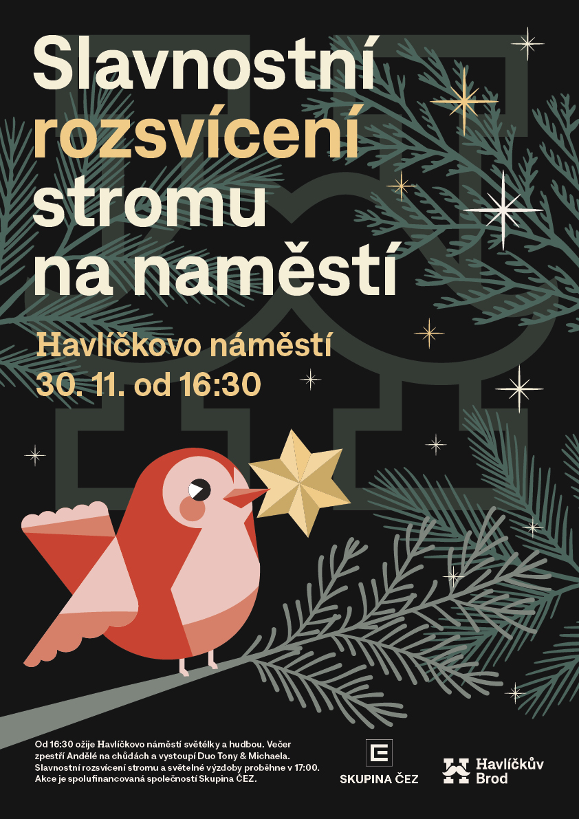 Od 16:30 ožije Havlíčkovo náměstí světélky a hudbou. Večer zpestří Andělé na chůdách a vystoupí Duo Tony & Michaela.