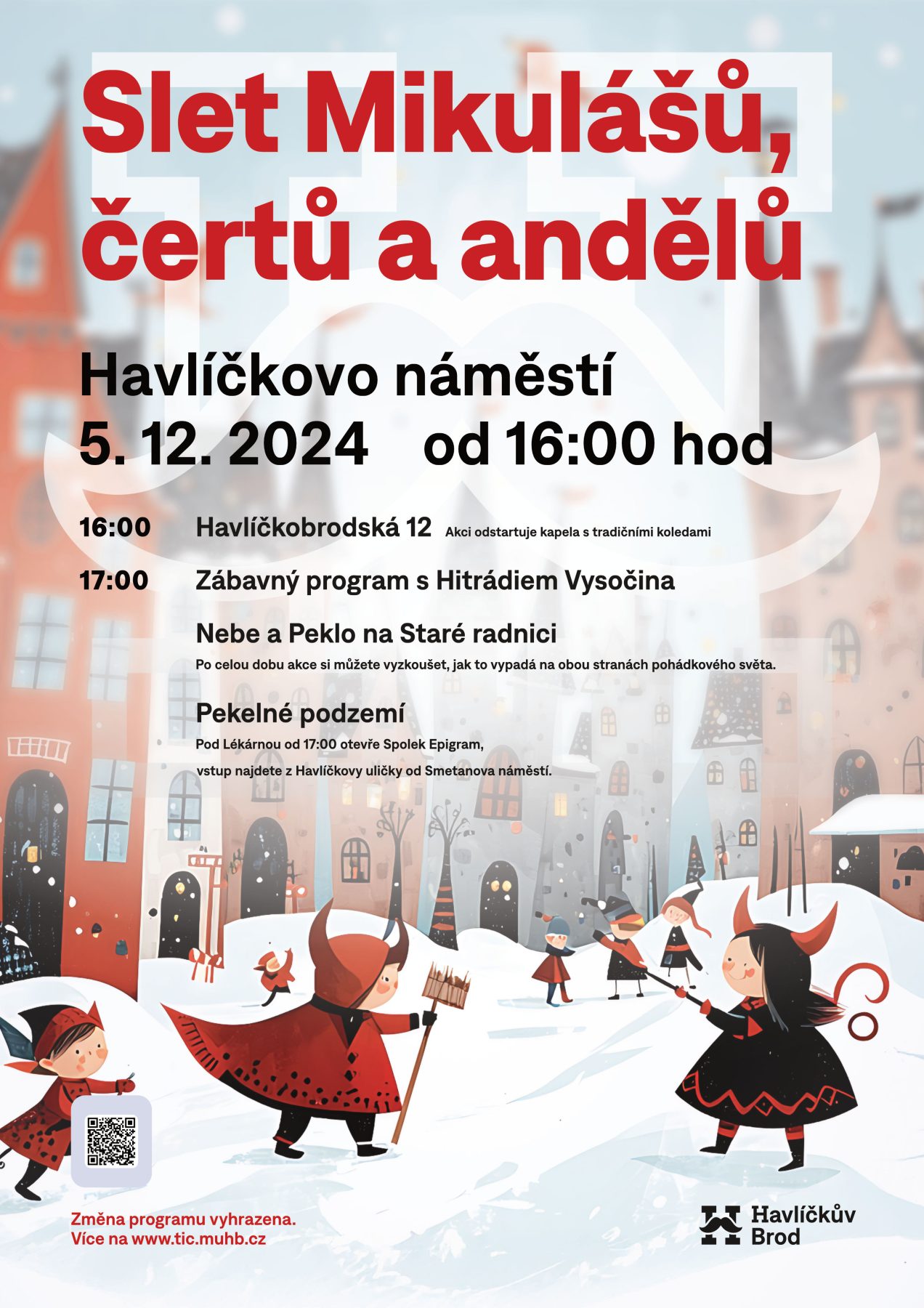 Přijďte 5. prosince na Havlíčkovo náměstí a zažijte tradiční Slet Mikulášů, čertů a andělů. Čeká vás sváteční odpoledne plné zábavy, pohádkových postav a vánoční nálady!