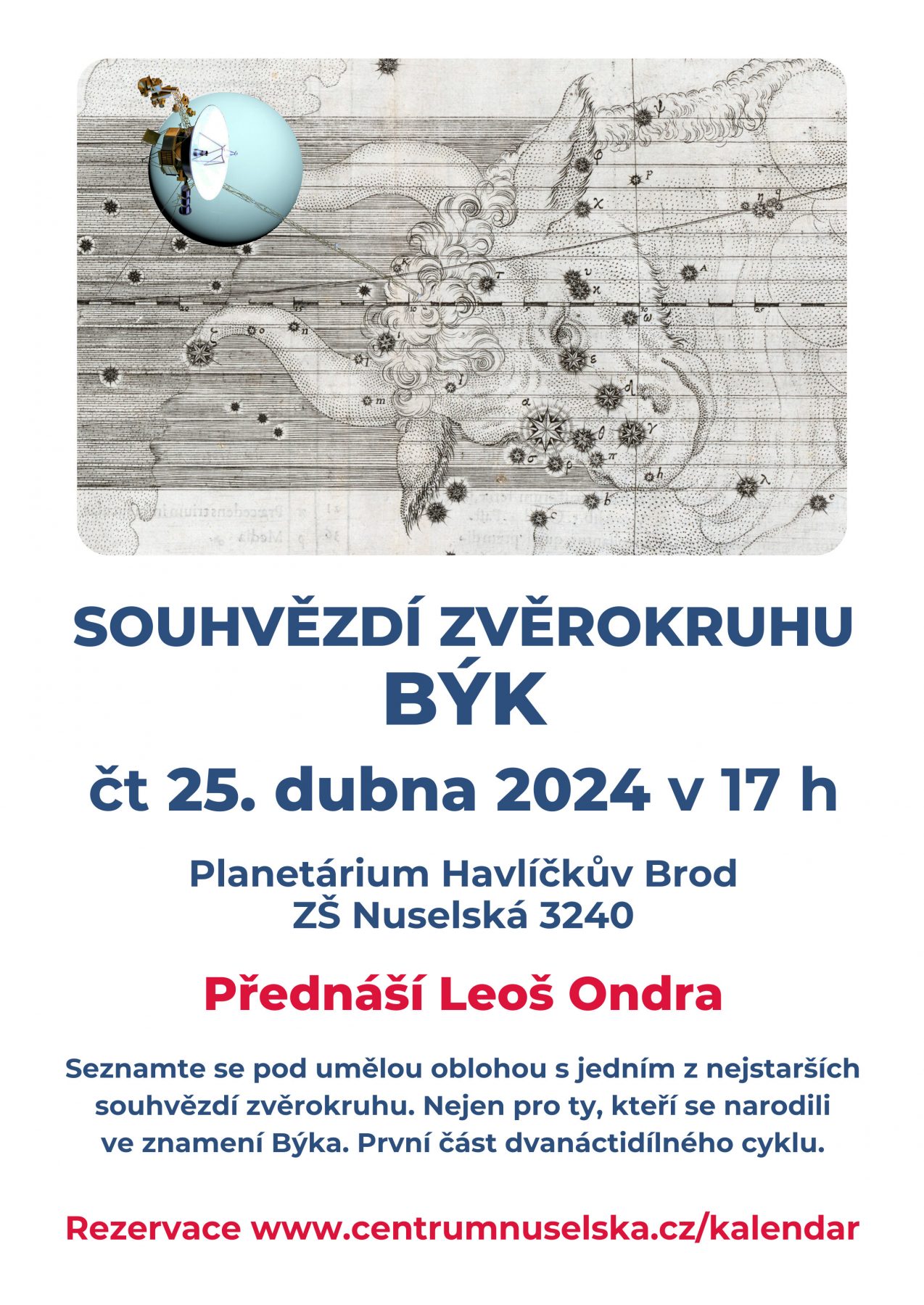 Odborný pracovník našeho přírodovědného centra pan Leoš Ondra připravil dvanáctidílný cyklus o všech souhvězdích zvěrokruhu. V prvním díle nám pod umělou hvězdnou oblohou v planetáriu představí souhvězdí Býka. Cyklus je samozřejmě určen všem zájemcům o hvězdnou oblohu, nejen těm, kteří se v konkrétním souhvězdí narodili.
