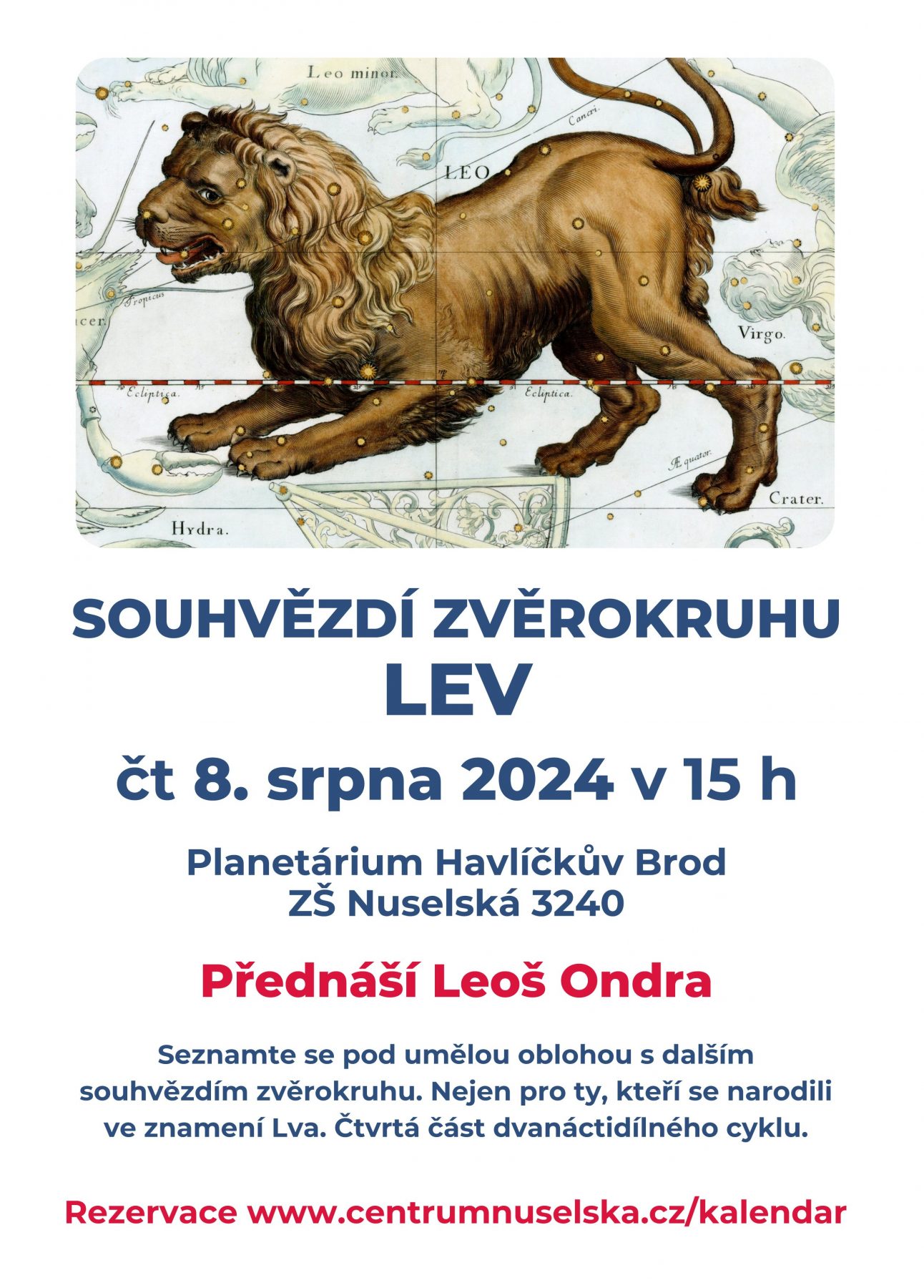 Odborný pracovník našeho přírodovědného centra pan Leoš Ondra připravil dvanáctidílný cyklus o všech souhvězdích zvěrokruhu. Ve čtvrtém díle nám pod umělou hvězdnou oblohou v planetáriu představí souhvězdí Lva. Cyklus je samozřejmě určen všem zájemcům o hvězdnou oblohu, nejen těm, kteří se v konkrétním souhvězdí narodili.