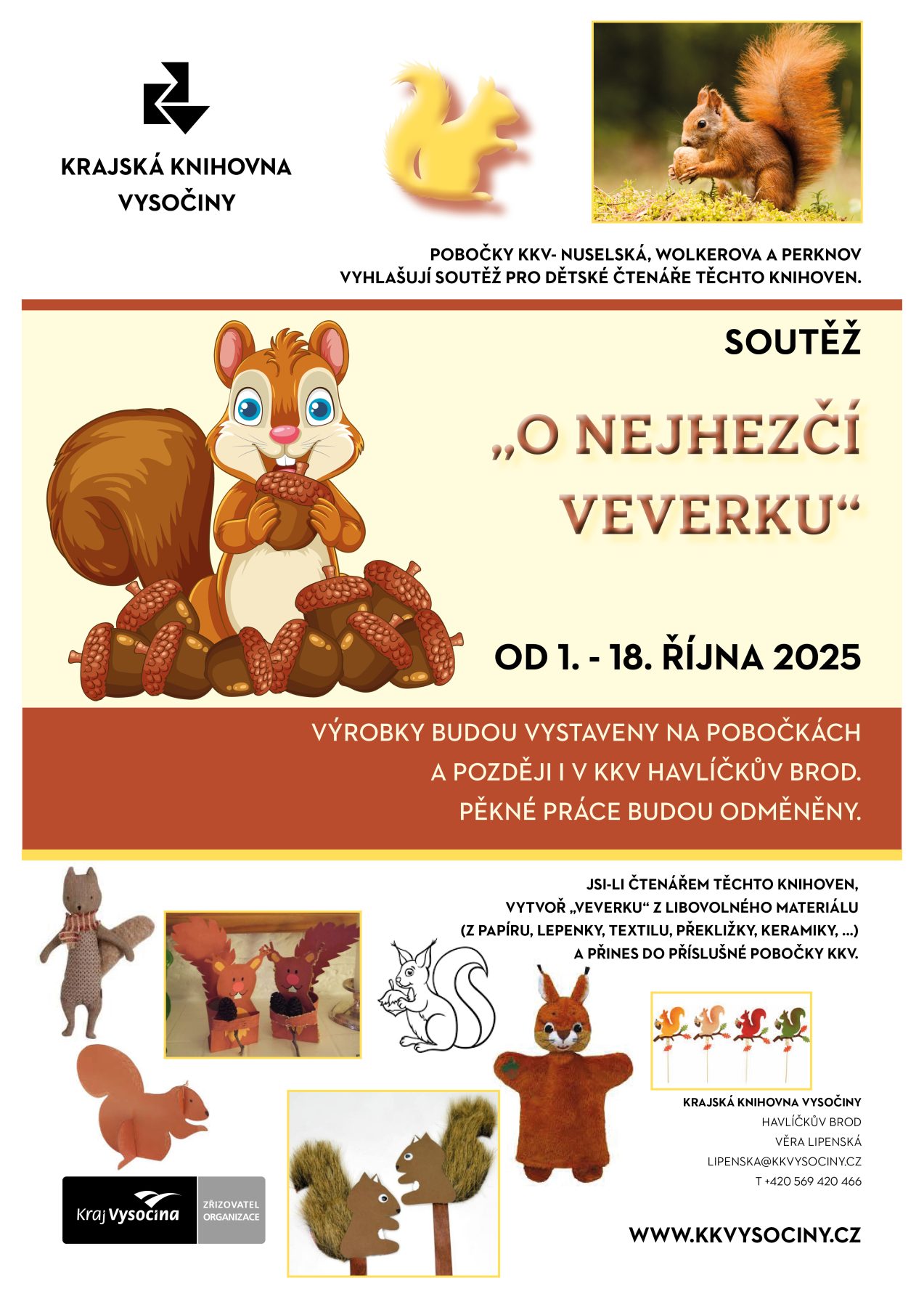 Jsi-li čtenářem jedné pobočky naší knihovny, vytvoř „veverku“ z libovolného materiálu (z papíru, lepenky, textilu, překližky, keramiky, …) a přines ji do příslušné pobočky. Výrobky budou vystaveny na pobočkách a později i v Krajské knihovně Vysočiny.