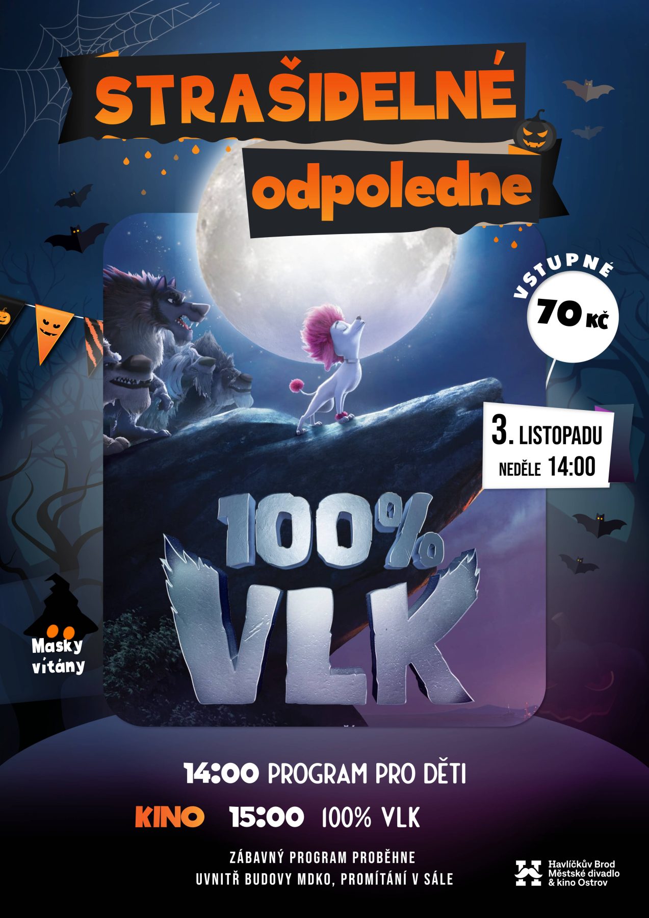 Děti se můžou těšit těšit na promítání dětské pohádky 100% VLK, která bude doprovázena zábavným programem plných her a aktivit.