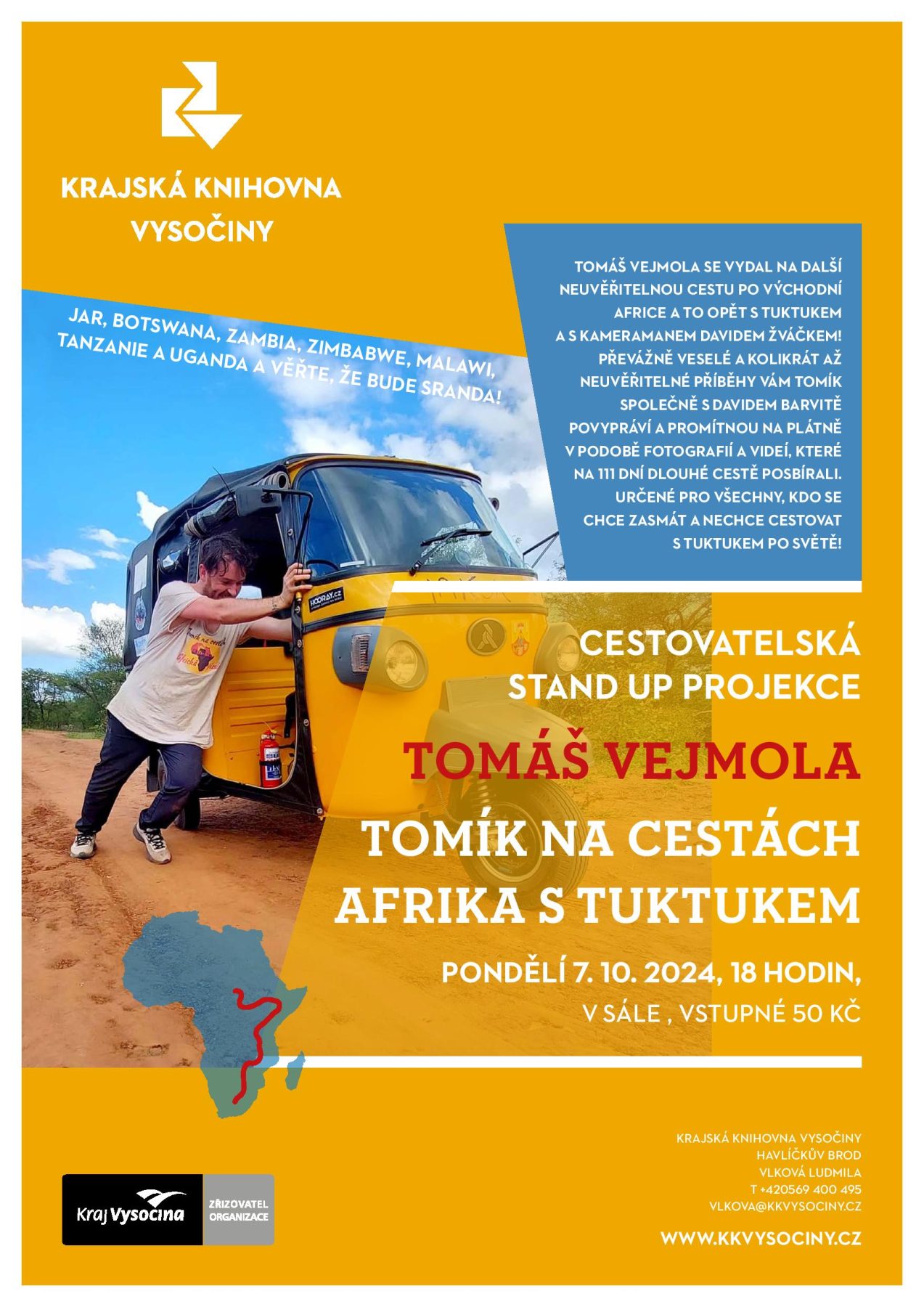 Tomáš Vejmola se vydal na NEUVĚŘITELNOU cestu po východní Africe s tuktukem a s kameramanem Davidem Žváčkem! Převážně veselé a kolikrát až neuvěřitelné příběhy vám Tomík a David barvitě povypráví a promítnou na plátně v podobě fotografií a videí, které na 111 dní dlouhé cestě posbírali.