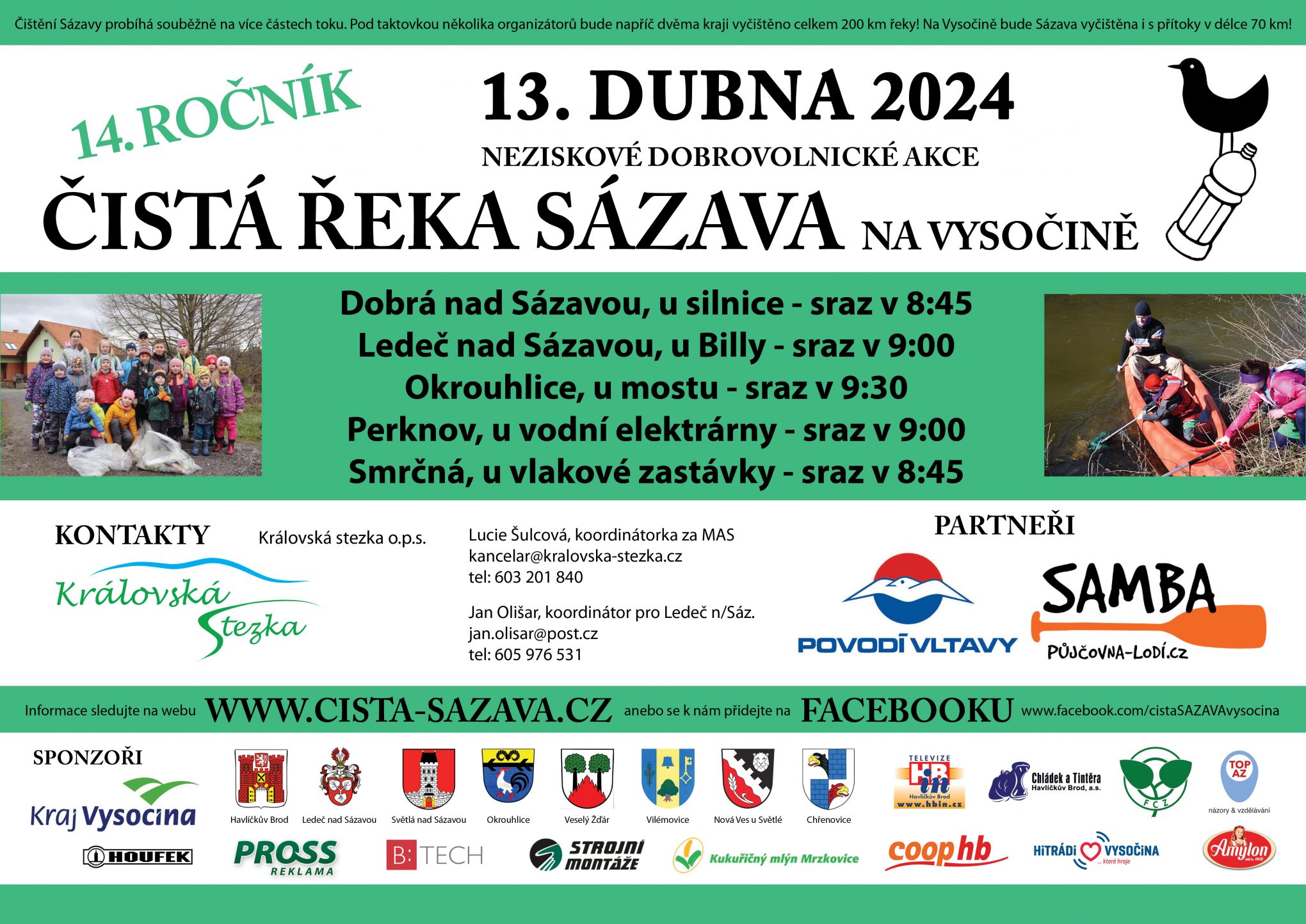 Tradiční akce Čistá řeka Sázava na Vysočině 2024 - dobrovolnické čištění řeky Sázavy od mechanických nečistot a odpadků, a to jednak jejího toku a jednak také břehů.