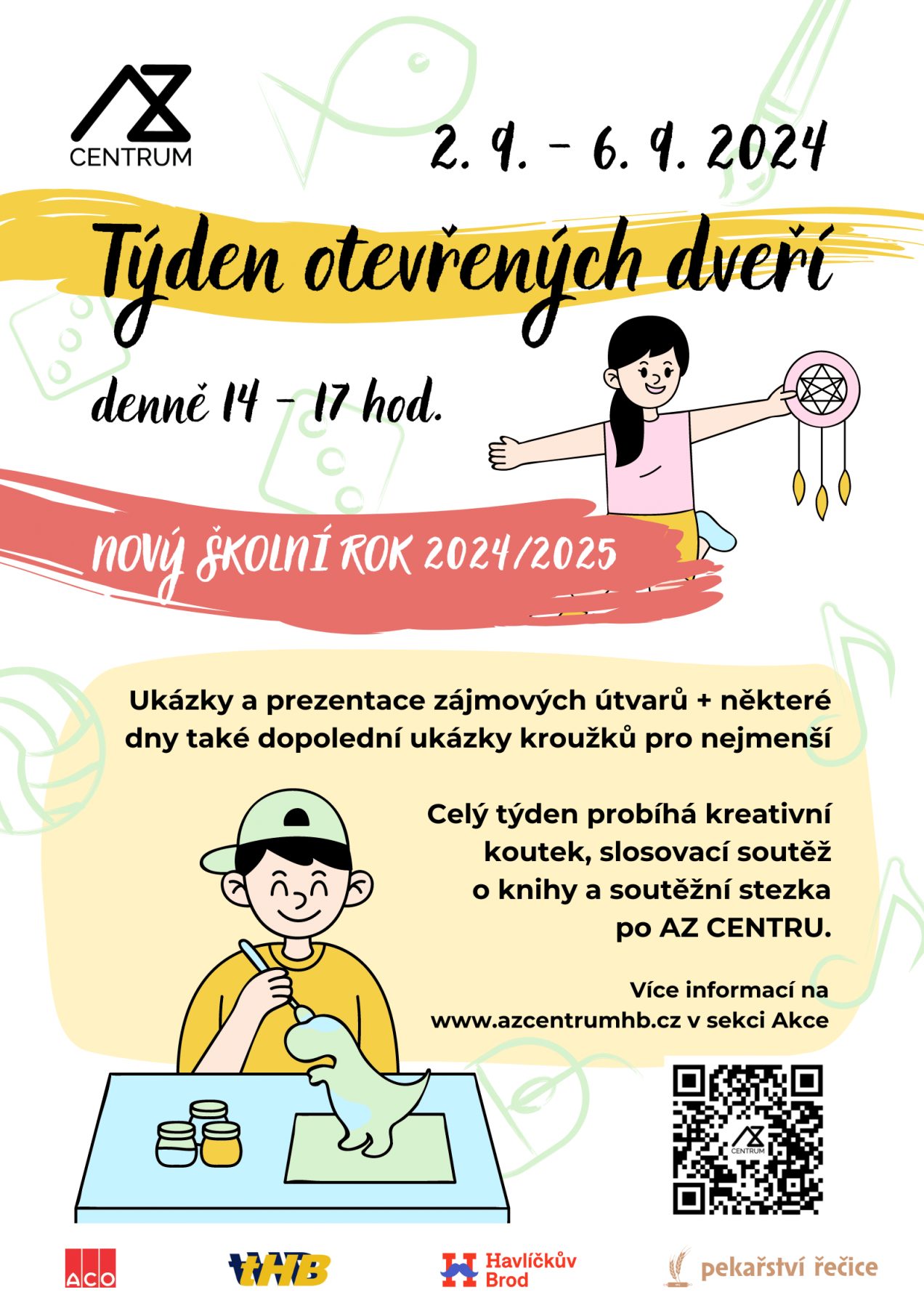 Vyzkoušejte si kroužky, zasoutěžte si a tvořte s námi. Ukázky a prezentace zájmových útvarů + některé dny také dopolední ukázky kroužků pro nejmenší. Celý týden probíhá kreativní koutek, slosovací soutěž o knihy a soutěžní stezka po AZ CENTRU.