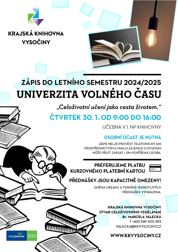 Zápis do letního semestru proběhne ve čtvrtek 30. 1. od 9:00 do 16:00 v Krajské knihovně Vysočiny (učebna v. 1. nadzemním podlaží).