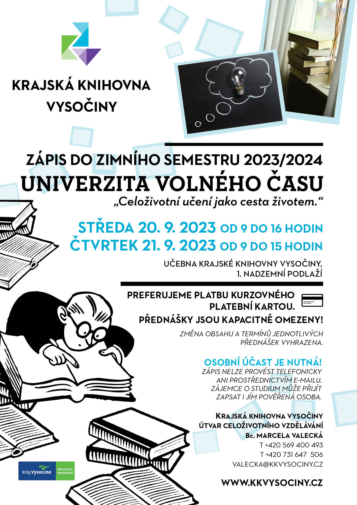 Zápis do zimního semestru, který začíná v říjnu, proběhne ve středu 20. 9. od 9:00 do 16:00 a ve čtvrtek 21. 9. od 9:00 do 15:00 v Krajské knihovně Vysočiny.