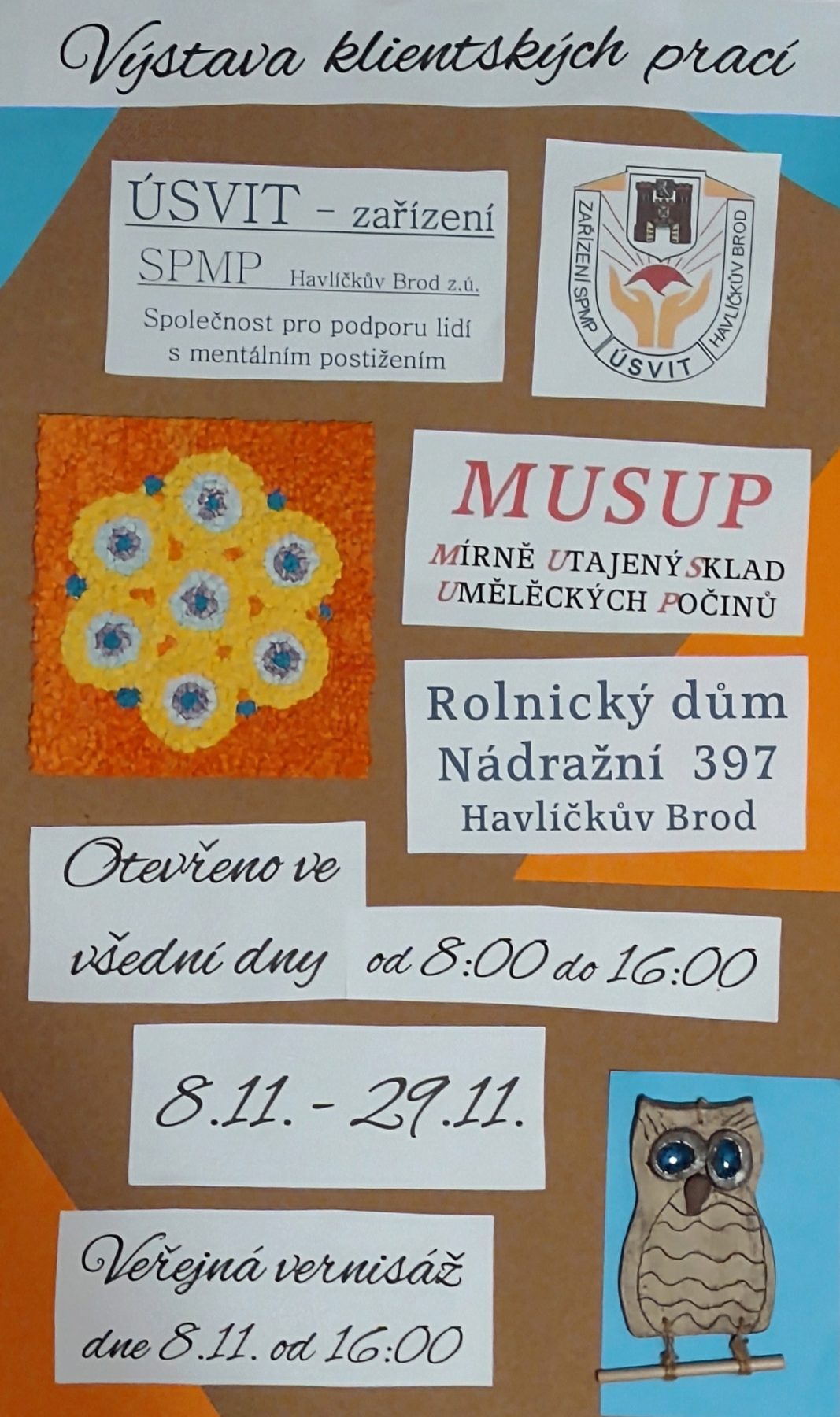 Po páteční vernisáži, na kterou je srdečně zvána široká veřejnost, bude výstava otevřená až do 29. listopadu každý všední den od 8 do 16 hodin. Svou návštěvou, a případně i koupí vybrané drobnosti pro radost, podpoříte činnost sociální služby, která pomáhá potřebným již od roku 1996. Jejím posláním je podpora individuálních potřeb osob s mentálním postižením a kombinovanými vadami. Snahou je především to, aby klienti žili podobný život jako lidé bez postižení, aby nezůstávali osamocení v sociální izolaci a aby měli možnost zažívat úspěchy i radost z vlastní vykonané práce.