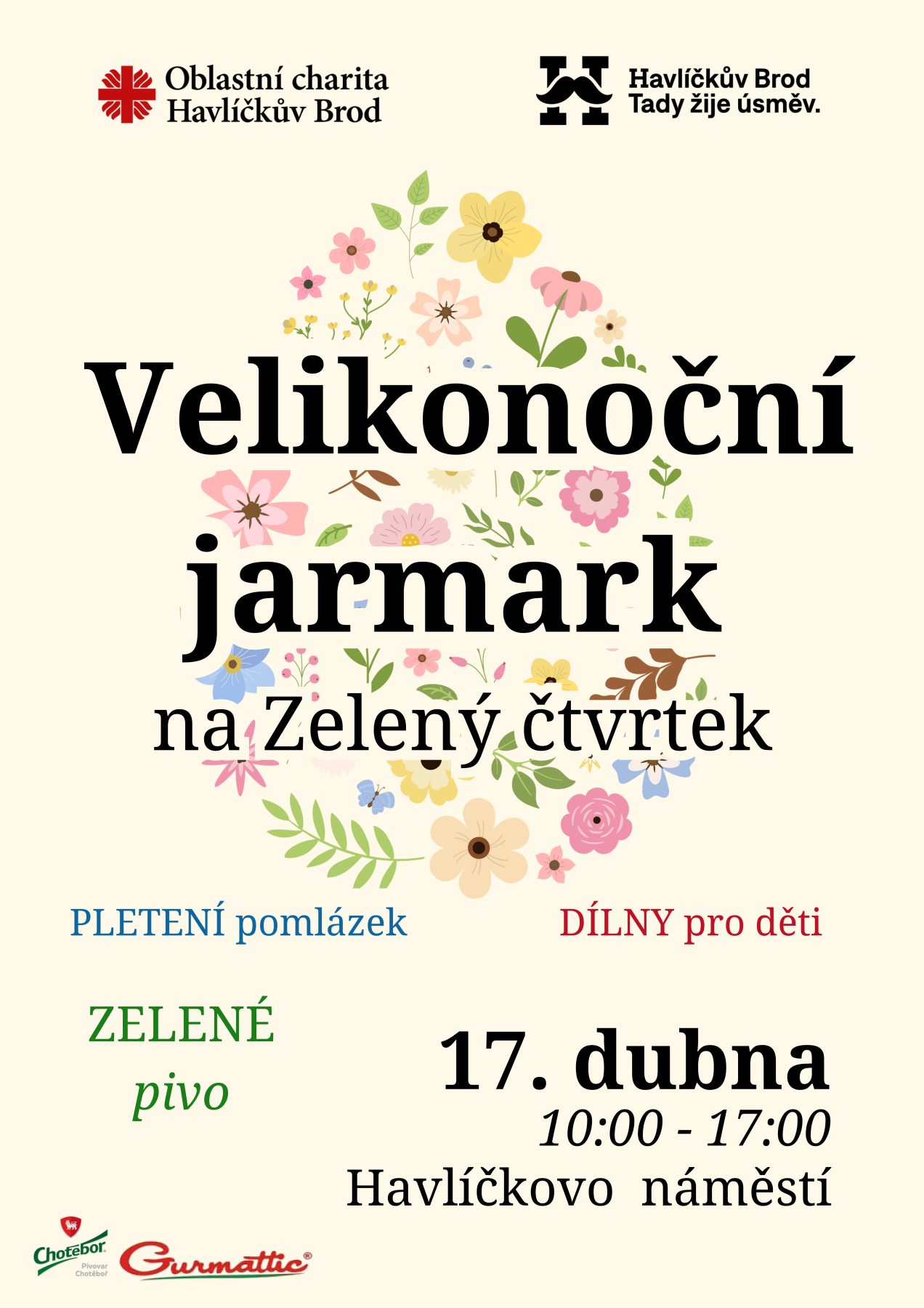 Oblastní charita Havlíčkův Brod ve spolupráci s městem Havlíčkův Brod Vás srdečně zve na Velikonoční jarmark, který se uskuteční ve čtvrtek 17. dubna od 10:00 na Havlíčkově náměstí v Havlíčkově Brodě.