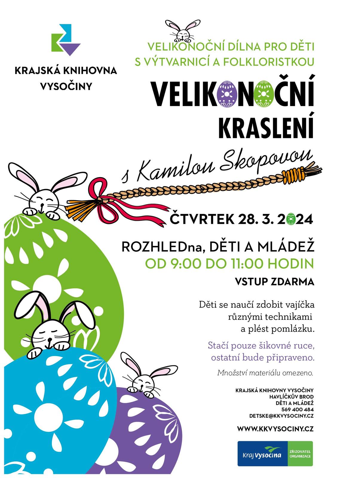 Oddělení Děti a mládež navštíví ve čtvrtek 28. března 2024 výtvarnice a folkloristka Kamila Skopová s velikonoční dílnou. Děti se naučí zdobit vajíčka různými technikami a mohou si uplést pomlázku. Stačí pouze šikovné ruce, ostatní bude připraveno.