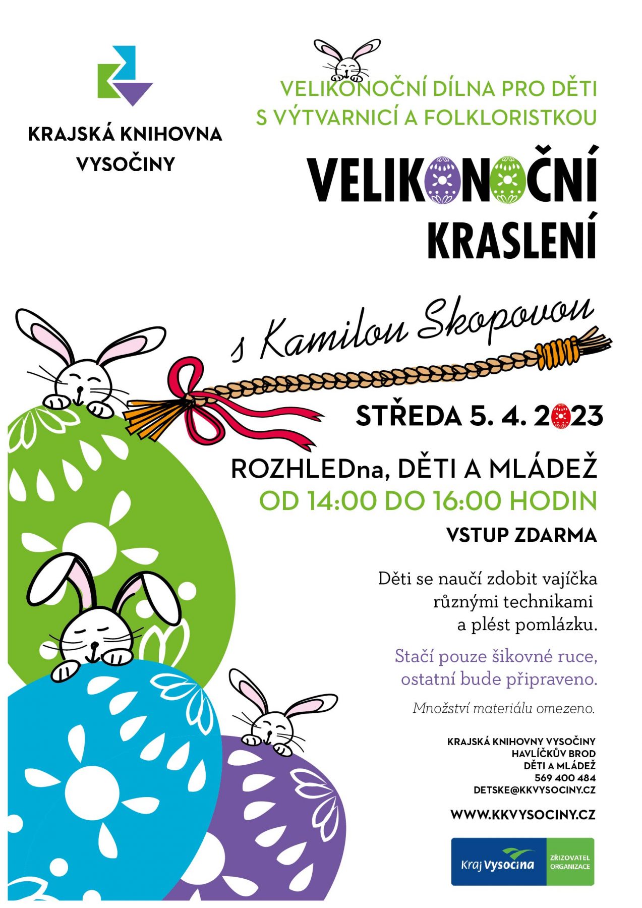 Oddělení Děti a mládež navštíví ve středu 5. dubna 2023 výtvarnice a folkloristka Kamila Skopová s velikonoční dílnou. Děti se naučí zdobit vajíčka různými technikami a mohou si uplést pomlázku. Stačí pouze šikovné ruce, ostatní bude připraveno.