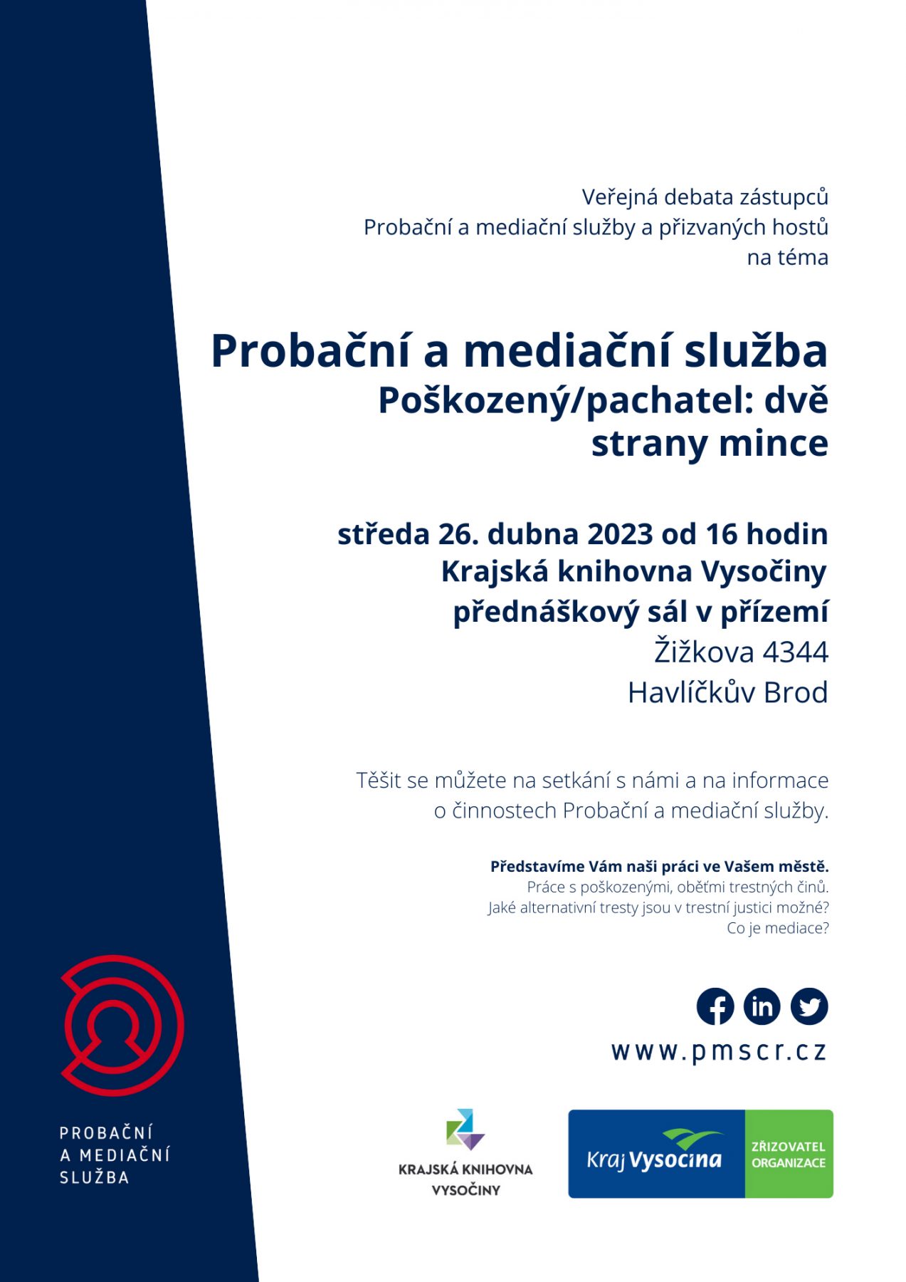 Zveme vás na veřejnou debatu zástupců Probační a mediační služby a přizvaných hostů na téma Probační a mediační služba – Poškozený/pachatel: dvě strany mince. Těšit se můžete na představení služeb Probační a mediační služby, informace o práci s poškozenými a oběťmi trestných činů, jaké alternativní tresty jsou v trestní justici možné a mnoho dalšího.