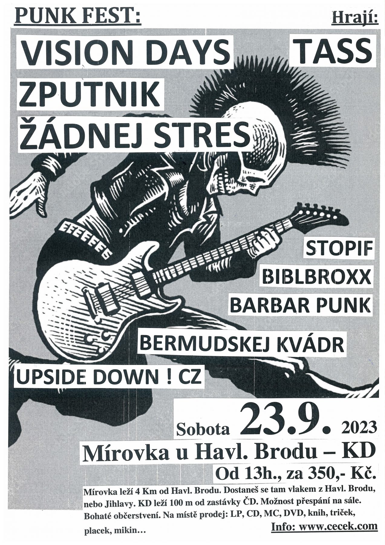 Hrají: Vision Days, Zputnik, Žádnej Stres, TASS, Bermudskej Kvádr, Upside Down ! CZ, Barbar Punk, Biblbroxx, Stopif... Vstup: 350,- Kč. ( jen na místě ).