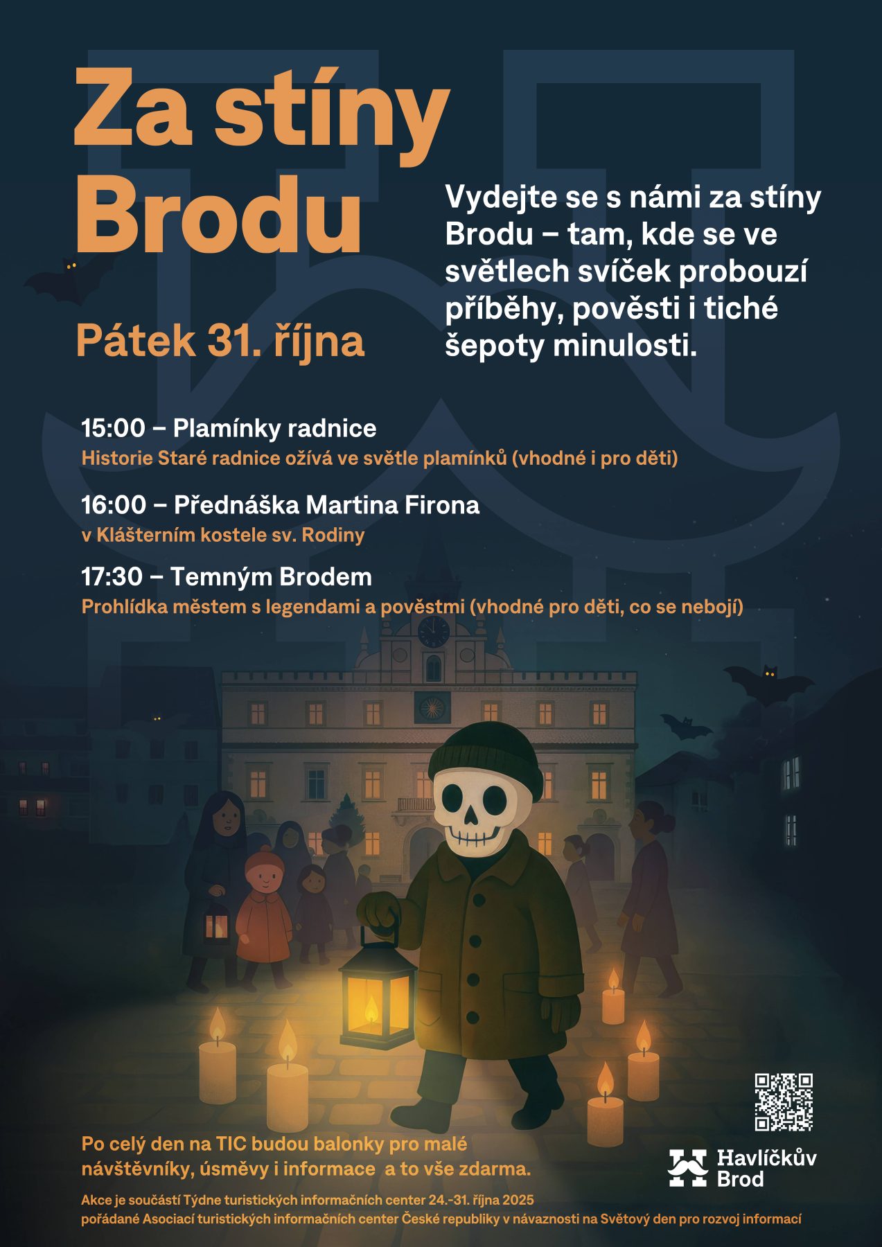 17:30 – Temným Brodem: Odvážní průzkumníci, vydejte se s námi na prohlídku městem plnou legend a pověstí. Tohle je pro děti, které se nebojí temnoty!
