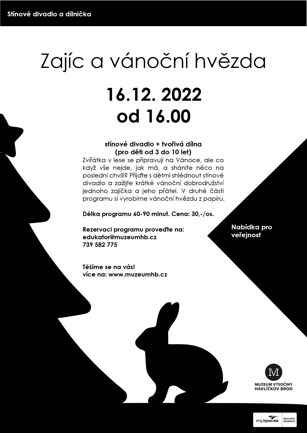 Zvířátka v lese se připravují na Vánoce, ale co když vše nejde, jak má, a sháníte něco na poslední chvíli? Přijďte s dětmi shlédnout stínové divadlo a zažijte krátké vánoční dobrodružství jednoho zajíčka a jeho přátel. V druhé části programu si vyrobíme vánoční hvězdu z papíru.