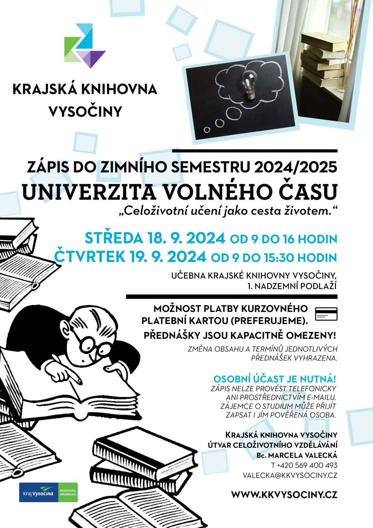 zápis proběhne ve středu 18. 9. od 9:00 do 16:00 a ve čtvrtek 19. 9. od 9:00 do 15:30 v učebně Krajské knihovny Vysočiny (1. nadzemní podlaží). Konkrétní termíny a náplně jednotlivých oborů - https://www.kkvysociny.cz/univerzita-volneho-casu. V tištěné podobě jsou k dispozici v informačních brožurách v knihovně (kancelář A – 1. NP, centrální pult). Bližší informace získáte rovněž u Bc. Marcely Valecké (kancelář A, 1. nadzemní podlaží, valecka%z%kkvysociny.cz, 569 400 493). Osobní účast na zápisu je nutná, zápis nelze provést telefonicky ani prostřednictvím e-mailu.