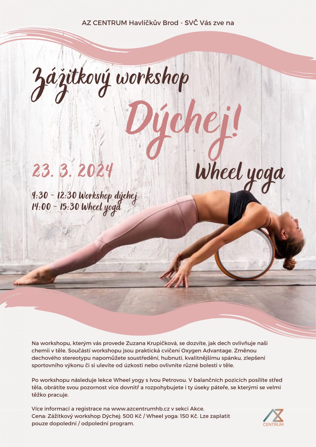 Na workshopu, kterým vás bude provázet Zuzana Krupičková, se dozvíte, jak dech ovlivňuje chemii v těle, tedy hormonální, imunitní a nervový systém. Za den uděláme cca 22 tisíc nádechů, a to buď funkčně nebo nefunkčně. Budete mít příležitost zjistit, jak na tom jste vy. Ukážeme si praktická cvičení Oxygen Advantage. Co dělat např. proti studeným rukám, nohám, úzkosti či motání hlavy. Jak si pomoci zpomalit, spát, soustředit se či zlepšit sportovní výkon. Ukážeme si možné kratší i delší relaxace. Změna dechového stereotypu pomáhá: - lepšímu spánku - hubnutí - soustředění - snížit dušnost - zlepšit sportovní výkon - ovlivnit různé bolesti v těle - mít úzkost pod kontrolou - zlepšit imunitu - prevence různých typů onemocnění více na: https://www.dobrymsmerem.cz/oxygen-advantage-prace-s-dechem/ Pokud budete chtít, můžete si po workshopu dát lekci Wheel yogy s Ivou Petrovou. Wheel yoga, neboli jóga s kruhem, je čím dál populárnější. Díky kruhům, kterými jsme pro vás vybaveni, si můžete užít vaši jógovou praxi trochu jinak. V balančních pozicích posílíte střed těla, vaše pozornost se obrátí více dovnitř a vy budete vnímat i ty nejjemnější pohyby. Wheel vám poslouží také jako rehabilitační pomůcka, díky které rozpohybujete i ty úseky páteře, se kterými se vám jinak těžko pracuje, a ulevíte si od bolesti. Kruh je velmi relaxační, pomůže vám uvolnit napětí a skvěle si s ním namasírujete záda a další ztuhlé partie. Wheel je ideální pro začátečníky i pokročilé jogíny. Začátečníci ocení hloubku protažení, která je s kruhem mnohem dostupnější, a zkušení jogíni se díky kruhu dostanou v ásanách do úplně nové dimenze.