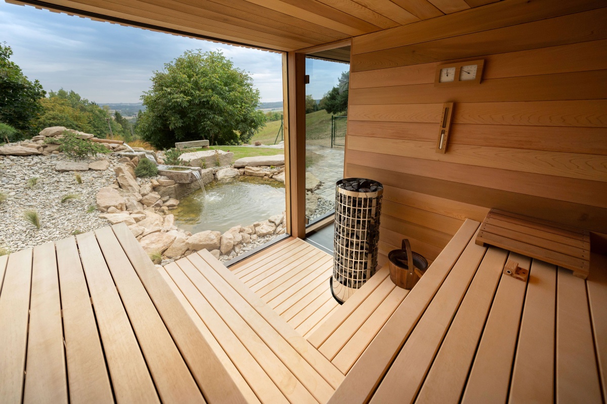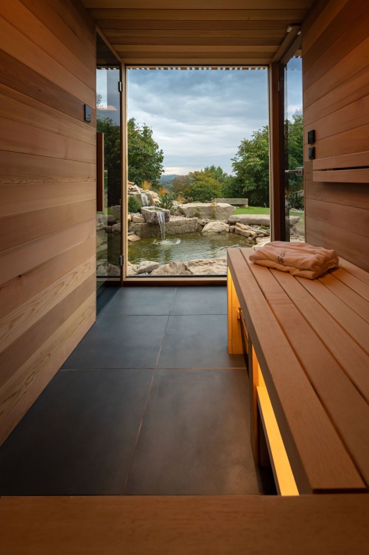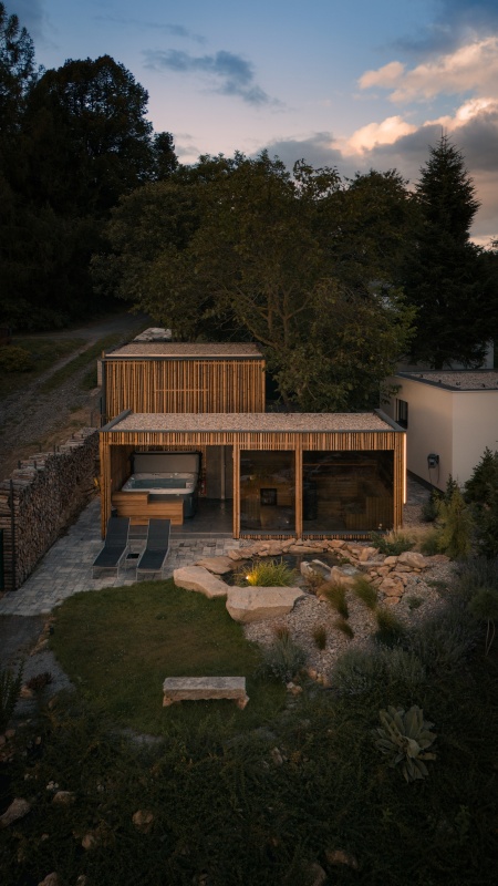 Součástí areálu je privátní wellness domek s vířivkou, cedrovou saunou a odpočívárnou, kde si hosté mohou dopřát relaxaci ve vlastním tempu. K dispozici je i venkovní ochlazovací jezírko, ideální pro osvěžení po saunování.
